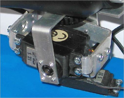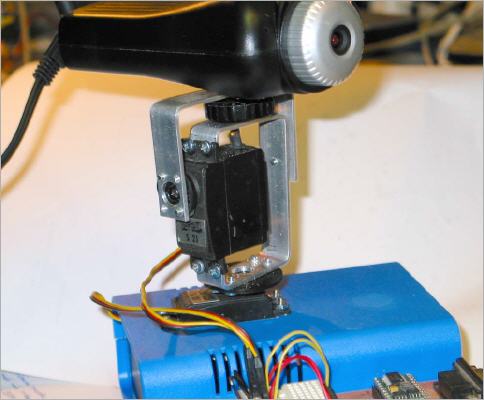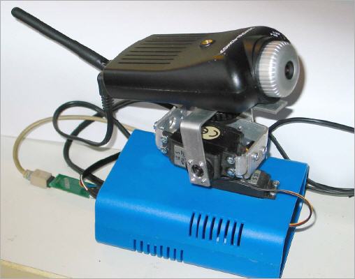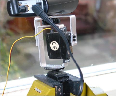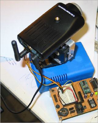 View of the camera pan & tilt. Standard servo motors are used to drive the camera horizontaly and vertically. For first tests a Basic Stamp BS2 and a breadboard are used (not shown). Later a PIC16F876 will do the job.