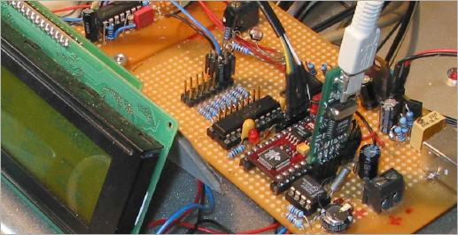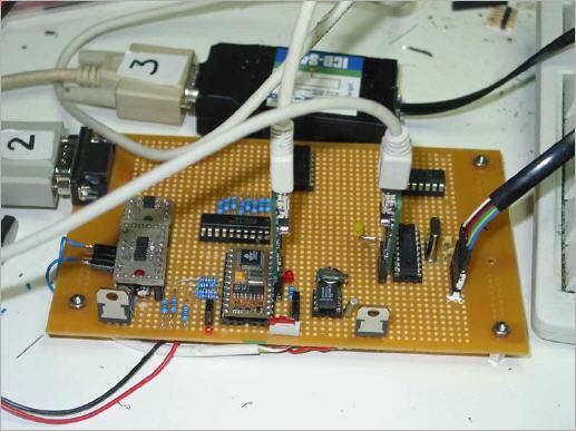 Basic Stamp2p24 and peripherals: EEPROM memory 2x64kByte, 11 channel 12 bit ADC, 2 channel 12 bit DAC, math-coprocessor and IO-extender (PIC16F628) + PCF8583 Real Time Clock. Sadly- sadly, these extensions where much too heavy for the Basic Stamp PBasic language. This is the point where Bromsmurf decided to make a definite move to the C language. And he did not regret this move for a second !!!