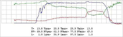 Verticale scale: Red = Temperature, 15 to 40 Centigrade. Green = Relative Humidity, 25 to 75% Blue = Light intensity, 0-100%