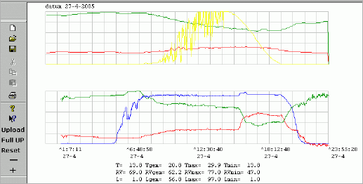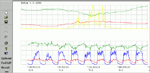 The weather graph of 5-5-2005 is included. In the Datalogger picture it corresponds to the third blue peak from the left, this can also be seen in the date printed on the x-axis. Here red and green are the standard colours, yellow is a measure for the energy in the light of the sun. |