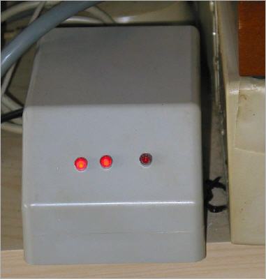 The washing mashine signalling device in action. From left to right the LED's mean: 1-washing mashine is running 2-heating is finished and 3-laundry dryer is running. This little cabinet can be placed anywhere, as long as there is a mains supply for power and data transmission.