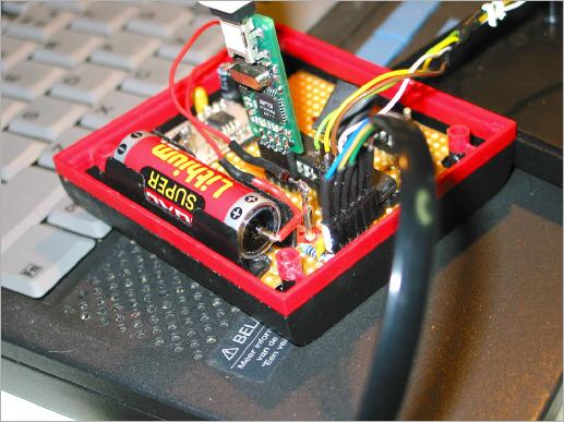 Bluetooth units 'master' and 'slave' The slave unit is in the upper left corner of the box, the master is the closer and larger print. The aim is, among other things, to develop efficient and effective protocols for starting, stopping and maintaining communications. A minimal subset of the Bluetooth protocol will be used to make things as easy to use as prossible.